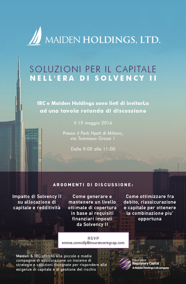 IRC e Maiden Holdings sono lieti di invitarvi alla tavola rotonda dal titolo "Soluzioni per il capitale nell'era di Solvency II".